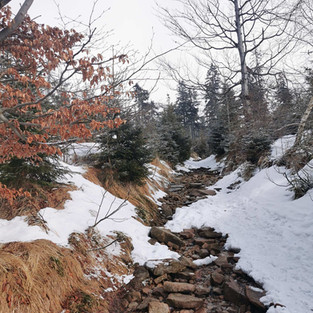 Kryteria wyboru noclegu to: punkt widokowy, nieopodal źródła Olzy i nie jest to rezerwat. Szczyt znajduje się około 5 km od Baraniej Góry. Po drodze jest odbicie do źródeł Olzy. Zaczynam brnąć w śniegu po wodę, ale decyduje się na wycofanie. Za dużo czasu zajmie dotarcie tam, a już się ściemnia. Postanawiam najpierw dojść na miejsce noclegu, rozbić namiot a potem iść po wodę. Po drodze jednak natrafiam na strumyk. Ja to mam szczęście. Znalezienie miejsca na namiot chwilę mi zajmuje. Przygotowuje platformę w coraz bardziej intensywnym deszczu. Zza chmur prześwituje księżyc, który jest w pełni. Czasem zrywa się mały wiaterek. Moszczę się w namiocie i przygotowuje kolację. Woda zagotowuje się błyskawicznie. Popijam gorącą herbatę. W tle słychać odgłos puszczyka i wiatru. W nocy cały czas pada, więc czasem się budzę. Jest niesamowicie wilgotno. Moja nadzieja na wschód słońca lega w gruzach. Zatem zakopuje się w śpiworek. Budzi mnie śpiew ptaków i promienie słońca. Poranki w łóżku zdecydowanie nie są tak atrakcyjne. W ciągu godziny po śniadaniu i spakowana ruszam w drogę.